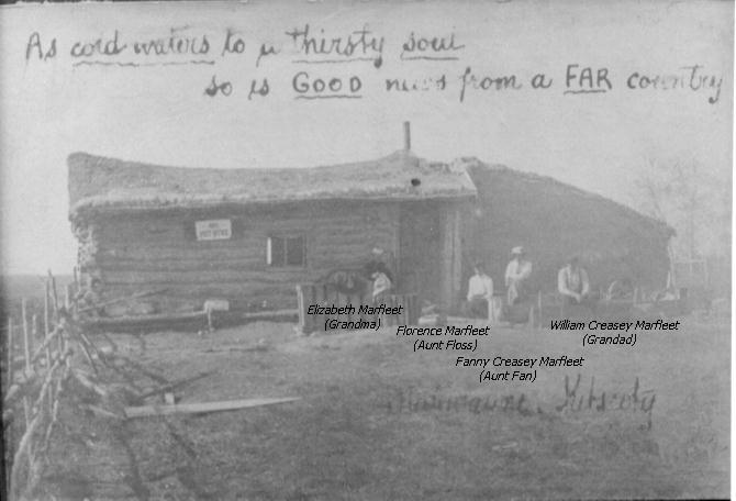 January 1977 a letter was received from Ena MARFLEET [K.030F-036] of Vancouver, British Columbia, in which Ena writes: "I am enclosing a 'skit' put on in Marwayne some years ago, which gives a pretty good idea of the trip. Nearly every one on the ship that brought the family out was sea sick. My husband was the only one that never missed a meal. Lots of times he would be the only member of the family at the table at meal times. Lots of little 'items of interest' of not mentioned in the 'skit'. Such as the pleasure of living in a sod roof shack. It would rain three days outside, and drip three more inside. Grandma Marfleet being an invalid spent most of her time in bed, which would be covered with every available pan and bowl. Also clouds and clouds of mosquitoes that plagued people and animals. The boys would work in lumber camps and brick yards in the winter time, so it was not long before a proper roof was put on the shack. There were no roads in the country, just prairie trails, full of pot holes. Provisions had to be brought in from great distances. Some would pack in big loads on their back, using snow shoes in the winter. Once they were able to get a team of oxen and a walking plow, land would be broken for a garden. Fortunately rabbits were plentiful and saved many a family from hunger. People nowadays cannot picture the life of a pioneer in those days. |
